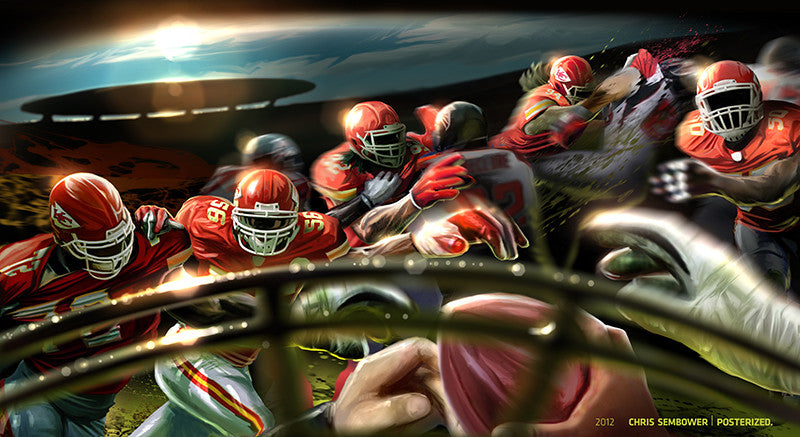 Painted in 2012 as a hype piece for the first game of the season, which was against the Falcons that year. This shows the view from Matt Ryan's facemask. A few former Chiefs make appearances in this one, including Glenn Dorsey and Tyson Jackson.